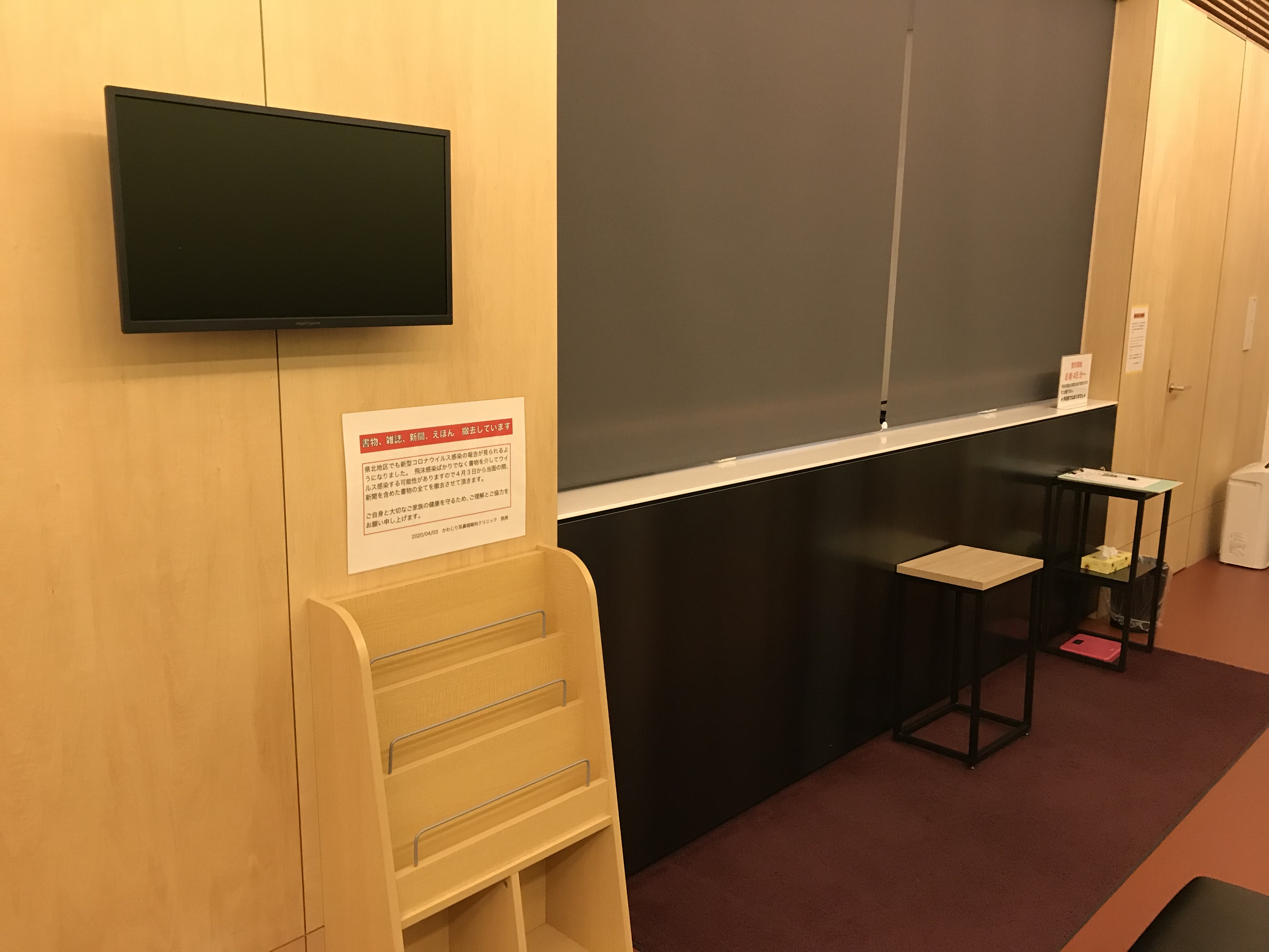 せっかくキッズスペースの椅子をリニューアルしたところですが、ウイルスの接触感染防止の観点から絵本、雑誌、新聞などを撤去しております。